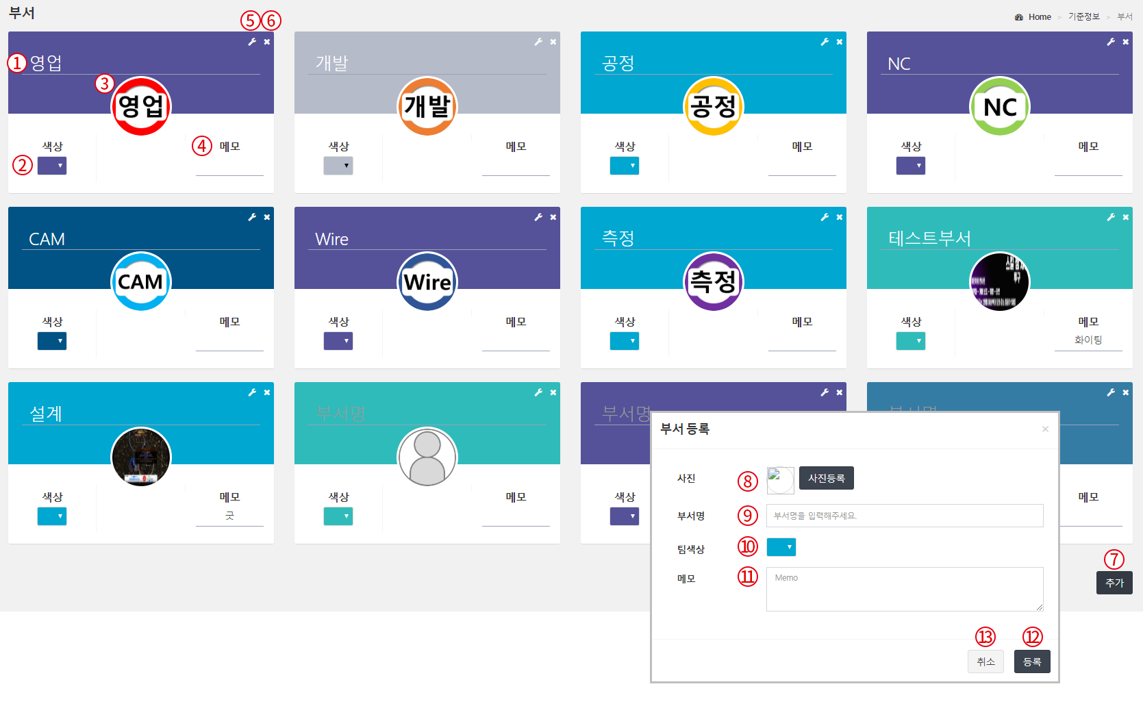 신규 등록 7. 신규 추가 버튼 8. 부서의 이미지를 선택한다. 9. 부서 명 입력란 10. 부서의 색상 선택란 11. 메모 입력란 12. 새로운 부서를 등록 한다. 13. 취소