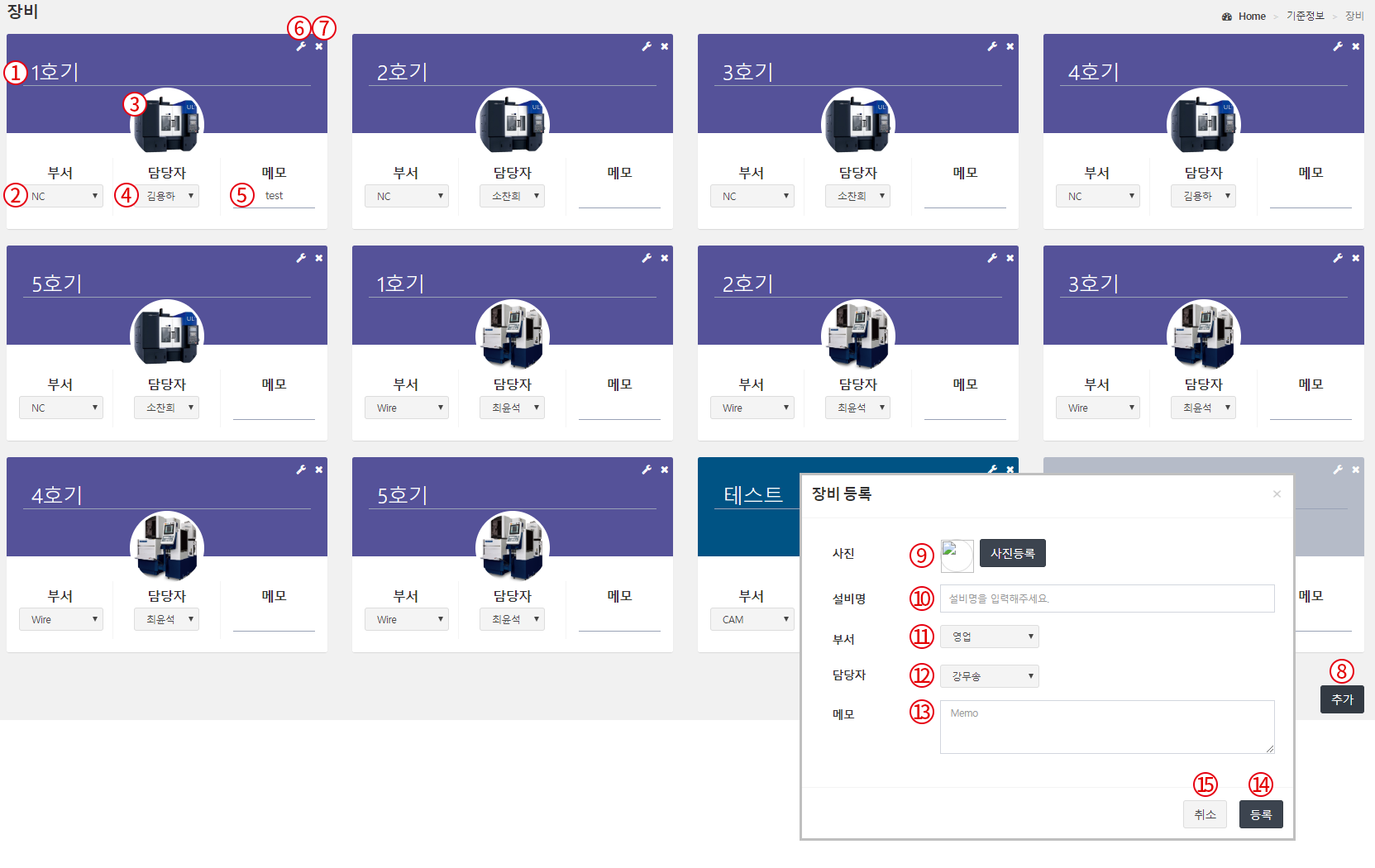 신규 등록 8. 신규 추가 버튼 9. 설비의 이미지 설정 10. 설비명 입력란 11. 설비의 담당부서 설정 12. 설비의 담당자 설정 13. 메모 입력란 14. 새로운 설비를 등록 한다. 15. 취소