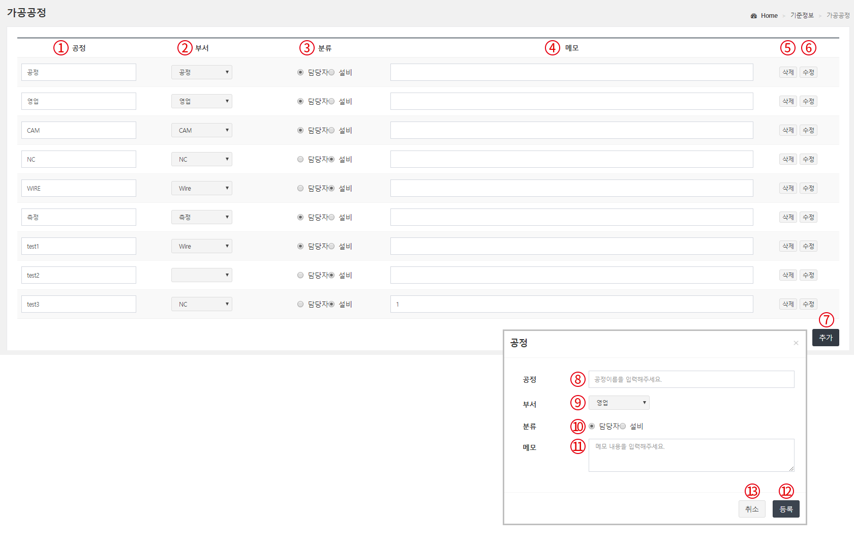 신규 등록 7. 신규 추가 버튼 8. 공정 이름 입력란 9. 공정의 담당 부서 설정 10. 해당공정이 사람이 하는 공정인지 설비가 하는 공정인지 설정 한다. 11. 메모 입력란 12. 등록 버튼 13. 취소